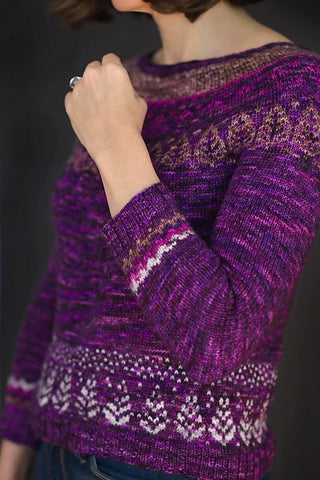 A top-down stranded colorwork sweater. Pattern by Casapinka.
