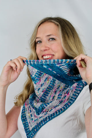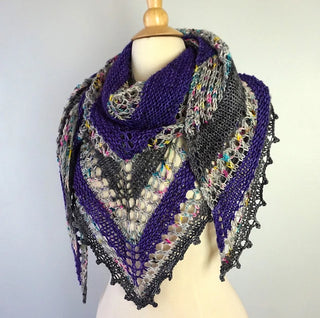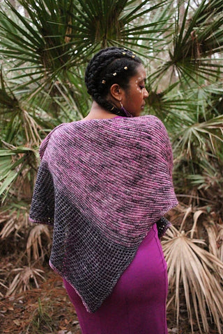The Dotted Daydreamer Shawl is an easily memorized, garter knit asymmetrical shawl with eyelets; well suited for mini sets, fades, and stash-busting.