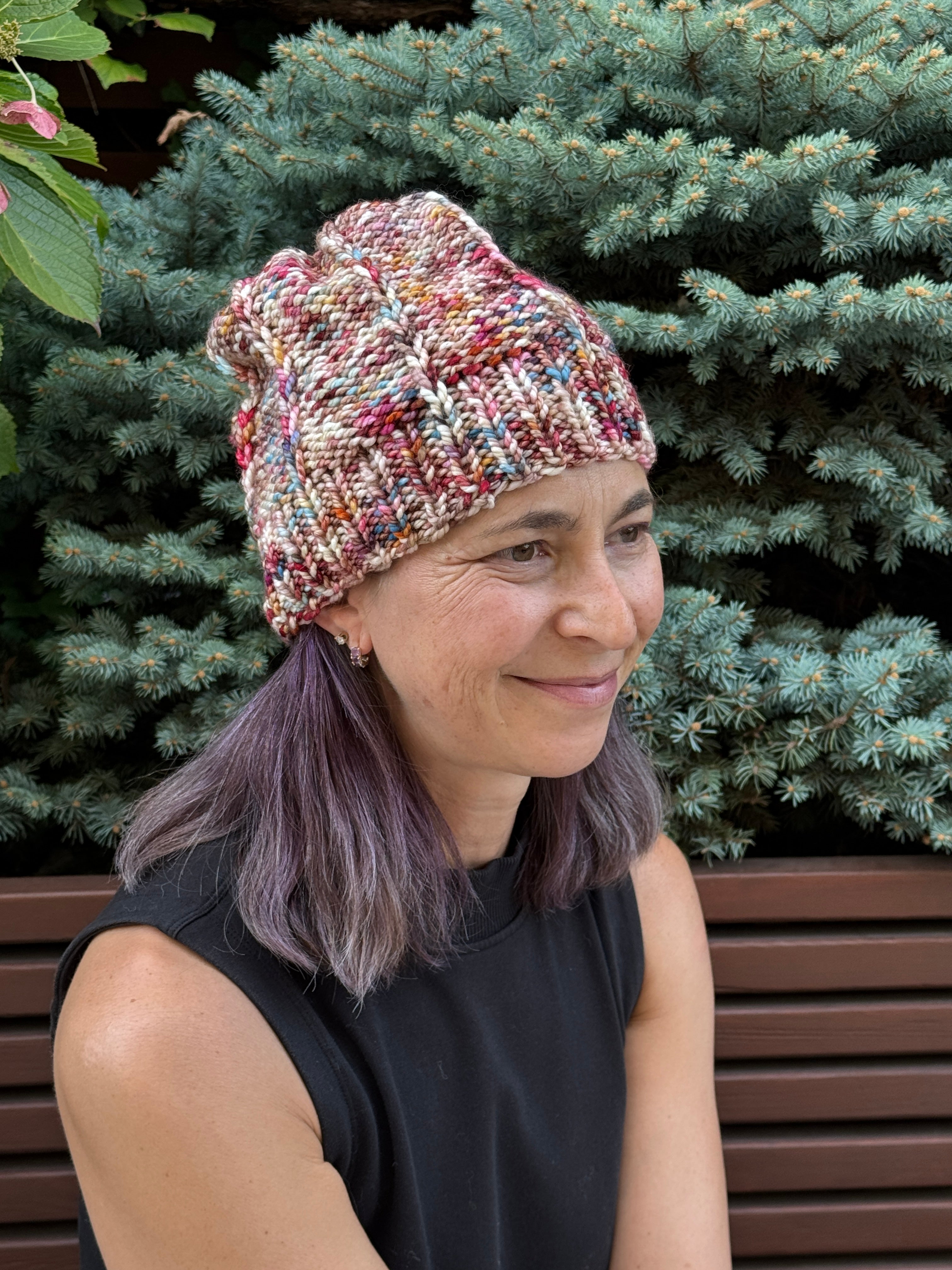 Angela's hat was knit with one skein of Merino Bulky in this colorway. The free pattern is the Slip and Purl Hat by Jackie Henderson. Ravelry Link